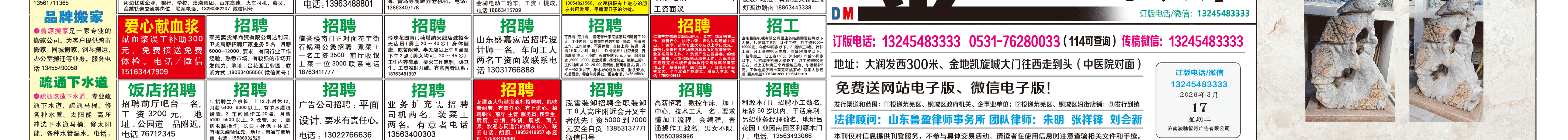 《萊蕪金點子廣告》報紙3月17日三、四版 http://www.bic34m.cn 發(fā)布日期:2026/3/17 11:22:21 文章作者:萊蕪金點子信息港